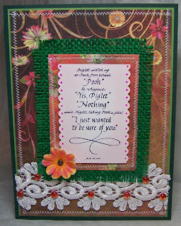 This next card uses Piglet sidled up to Pooh. It is stamped on the back of an advertisement post card (I've got this old stack and want to use them up) with Archival ink jet black. I die cut it with Spellbinders long classic scalloped rectangle and then the top and bottom trimmed off. Inked the edges with Distress ink spun sugar and added the dots with a Tombow marker. I cut a piece of Prima fairy floral paper and a piece of green burlap and sewed them together. Also stitched around another trimmed piece of fairy floral paper. Layered everything as shown including the piece of lace. Dew drops added along lace. The flower was colord with Tombow markers and a brad added to the center.