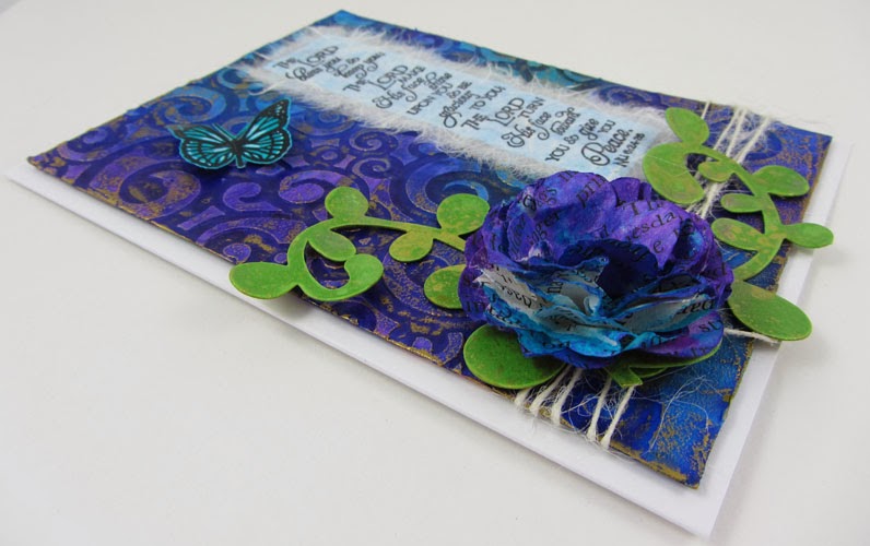So that background technique I mentioned yesterday... Yep, used it on this card. I wish you could feel it, lol. The butterfly is a The Stamp Pad Co stamp, The scripture is from Our Daily Bread Designs. The flower is made from book pages. Punch out several flowers, stack them up offsetting the petals, add a brad to the center, scrunch each flower to the center individually, pull them back from the center, spray with color and dry. I also added tiny gold beads to the center gluing them on with Glossy Accents.