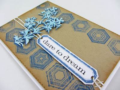 A quick card I did for Memory Bound Store. Stamps are Stamper's Anonymous (Tim Holtz) Patchwork Pieces #CMS270 and Simple Sayings #CMS155. Stamped onto Kraft Card with Distress Oxide Faded Jeans and edged with regular distress Vintage Photo. Words are stamped with Archival Ink jet black and border with DOX faded jeans, cut by hand, holes punched. String is Tim Holtz Idea-ology. Flowers are die cut (Sizzix, Tim Holtz, Wildflowers #2) from white cardstock - 4 of them. Two are inked with DOX faded jeans. The other two were inked with clear ink, embossed with Frosted Crystal powder (Ranger) and sprayed with Distress Spray Stain tumbled glass.