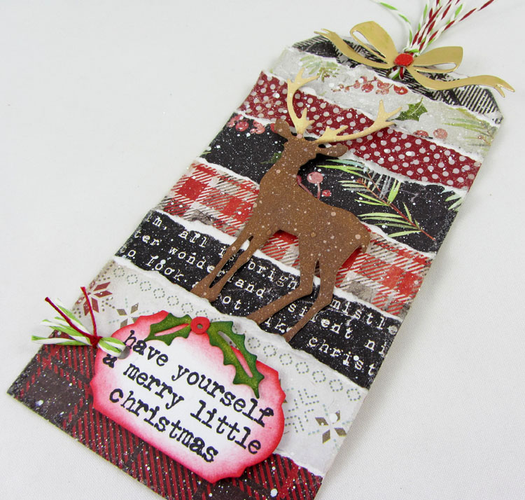 I attached the stamped panel to the corrugate with foam tape and then the poinsettia to the stamped panel with Heavy Gel. After allowing it to dry completely I added white brads, white wire, and a sticker from the Tim Holtz Holiday Talk Metallic pack. Yep, I should have added the hanger before I glued everything together but I didn't know I was putting a hanger on then, lol.