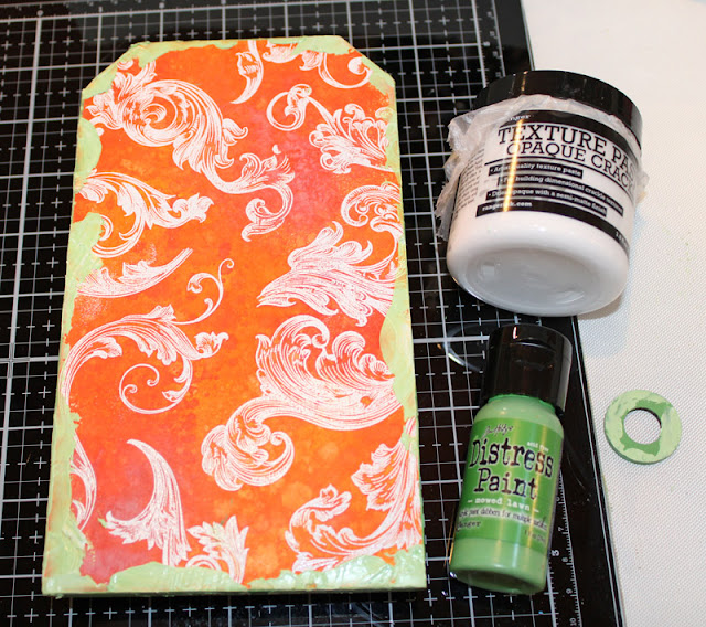 I painted the very edge of the tag and the hole reinforcer with Distress Paint then mixed a bit of paint with Crackle Paste and added it as shown.